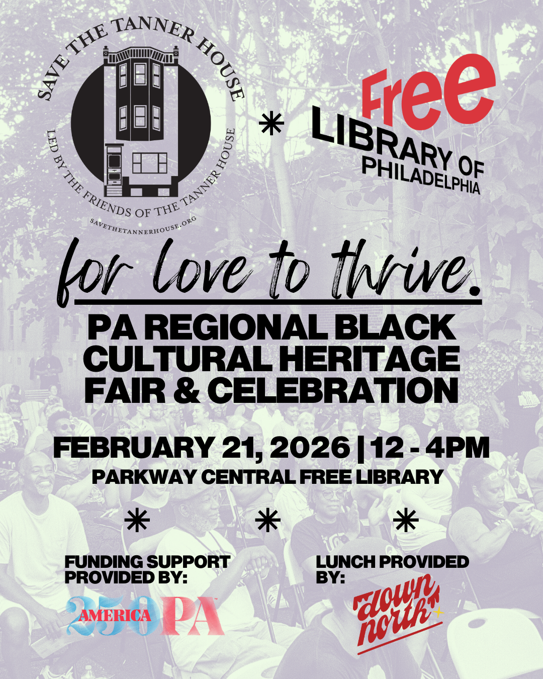 Friends of the Tanner House & Free Library Philadelphia present the first-ever For Love to Thrive Black Cultural Heritage Fair & Celebration on February 21, 2026 @ Parkway Central Free Library